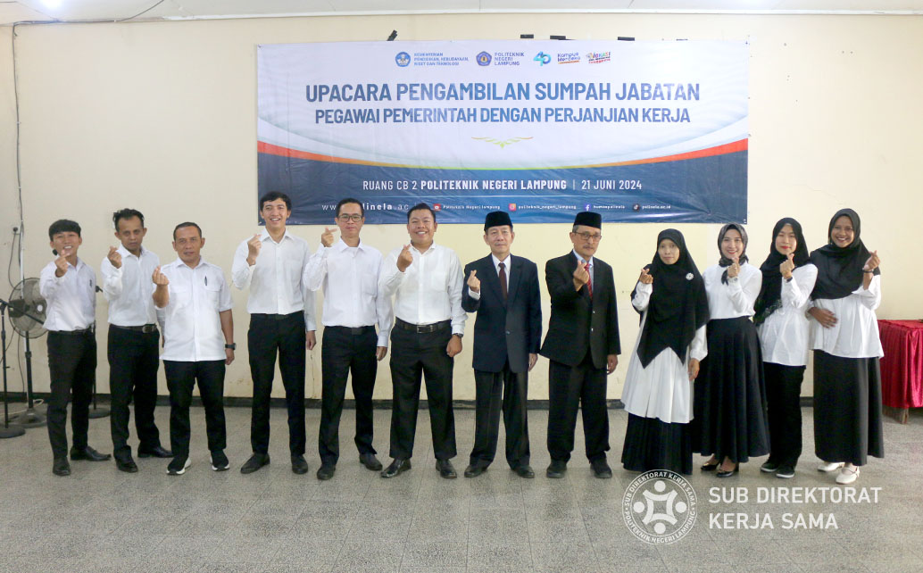 Polinela, Jum’at (20/06/2024). Politeknik Negeri Lampung (Polinela) menggelar kegiatan pengambilan sumpah bagi 10 Pegawai Pemerintah dengan Perjanjian Kerja (PPPK). Kegiatan ini berlangsung di Ruang CB 2 Polinela, disaksikan oleh jajaran pimpinan, dosen, serta keluarga besar Polinela.