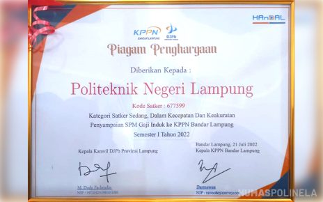 Polinela, Rabu (29/09/2021). Sebanyak 153 mahasiswa Politeknik Negeri Lampung (Polinela) mengikuti wisuda daring pada 25 September 2021. Ini merupakan wisuda daring kelima Polinela di masa pandemi virus Corona (covid-19). Para wisudawan mengikuti sidang senat terbuka dan seremoni wisuda dari rumah masing-masing melalui platform Zoom dan akun YouTube Polinela (https://www.youtube.com/watch?v=iqjytyaHd1c&ab_channel=PoliteknikNegeriLampung). Sementara itu, para Senat, Direksi, dan 6 wisudawan terbaik tingkat Polinela dari 5 Jurusan mengikuti seremoni wisuda di Ruang Sidang Utama Polinela dengan menggunakan aturan protokol kesahatan Covid-19. Acara di mulai dengan pembacaan doa oleh Sudiyo, S..S.I., M.A. untuk kelancaran acara, kesuksesan para wisudawan dimasa yang akan datang, dan keselamatan untuk bangsa Indonesia. Pada acara tersebut juga dilaksanakan penyerahan Piagam Penghargaan dan Tanda Kehormatan Satya Lancana Karya Satya 30 tahun kepada Aparatur Sipil Negera (ASN) di lingkungan Polinela sebanyak 27 ASN.