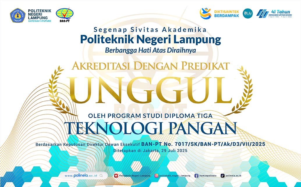 Polinela, Jum’at (03/10/2025). Politeknik Negeri Lampung (Polinela) mencatatkan prestasi membanggakan di dunia pendidikan tinggi vokasi. Jurusan Teknologi Pertanian melalui Program Studi Teknologi Pangan (D3) berhasil meraih Sertifikat Akreditasi dengan peringkat “Unggul” dari Badan Akreditasi Nasional Perguruan Tinggi (BAN-PT). Sertifikat tersebut berlaku sejak 29 Juli 2025 hingga 29 Juli 2030, menegaskan mutu akademik dan tata kelola program studi yang telah memenuhi standar nasional tertinggi.