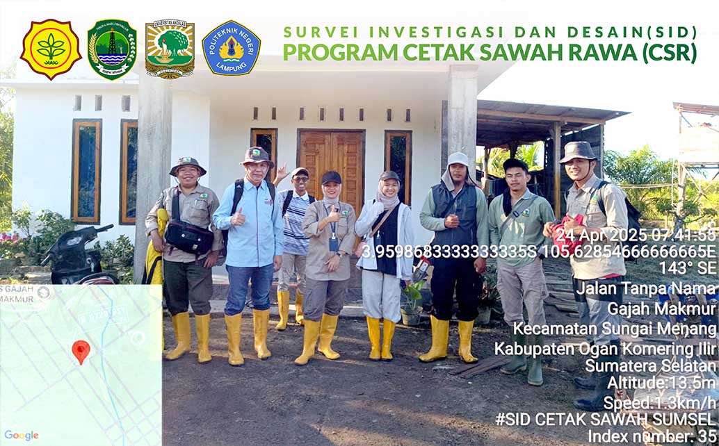 Polinela, Senin (28/04/2025). Program Studi Mekanisasi Pertanian Politeknik Negeri Lampung (Polinela) menunjukkan kontribusi nyata dalam mendukung Program Strategis Nasional Cetak Sawah Rawa (CSR) yang dilaksanakan oleh Kementerian Pertanian. Melalui keterlibatan dalam kegiatan Survei Investigasi dan Desain (SID) Cetak Sawah Rawa,