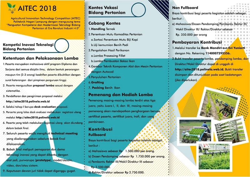 Agricultural Innovation Technologi Competition (AITEC) Politeknik Negeri Lampung dengan mengusung tema “Penguatan Kompetensi dan Modernisasi Teknologi Bidang Pertanian di Era Revolusi Industri 4.0”.