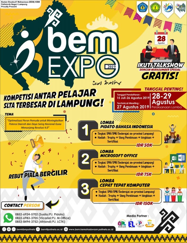 BEM EXPO merupakan acara tahunan kementerian pendidikan BEM KBM POLINELA yaitu seminar talk show dan lomba-lomba yang pasti nya menarik❗❗