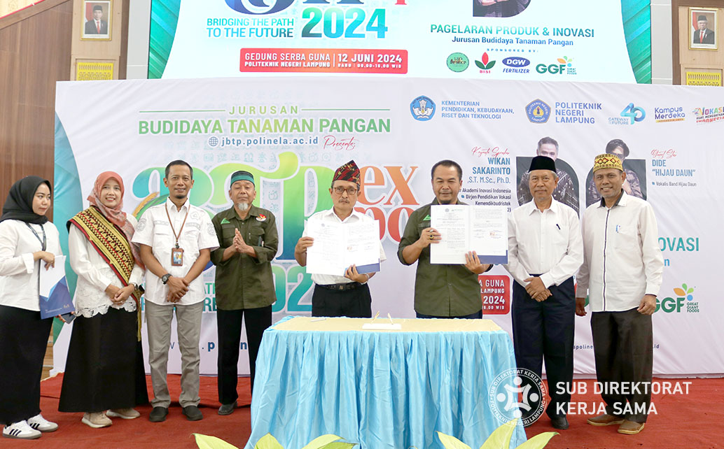 Polinela, Jum’at (14/06/2024). Pada kegiatan BTP EXPO 2024 yang diselenggarakan oleh Jurusan Budidaya Tanaman Pangan (BTP) Politeknik Negeri Lampung (Polinela) menjadi momen penting dengan dilakukannya penandatanganan Memorandum of Understanding (MoU) dan Perjanjian Kerja Sama (PKS) antara Jurusan BTP Polinela dengan PT. Ghalli Roelies Indonesia (PT. GRI). Penandatanganan tersebut diwakili oleh Prof. Dr. Ir. Sarono, M.Si. (Direktur Polinela), Khairullah, KM. S.T., MMP. (Direktur Utama PT. GRI), didampingi Prof. Dr. Ir. Wan Abbas Zakaria, M.S., dan Dr. Ir. Sutikno, M.Sc.