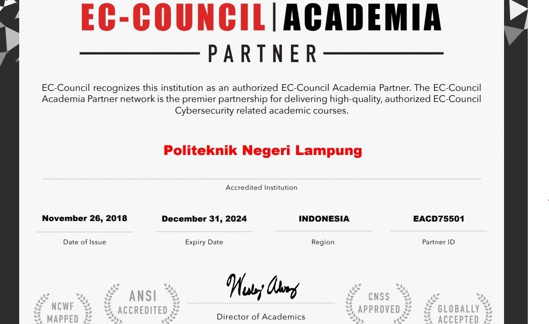 Sebagai Mitra Akademik Resmi EC-Council, Politeknik Negeri Lampung akan dapat menyediakan kursus dan sertifikasi keamanan siber yang diakui secara internasional kepada mahasiswa. Hal ini akan membantu menghasilkan para profesional keamanan siber yang siap menghadapi ancaman digital yang terus berkembang.