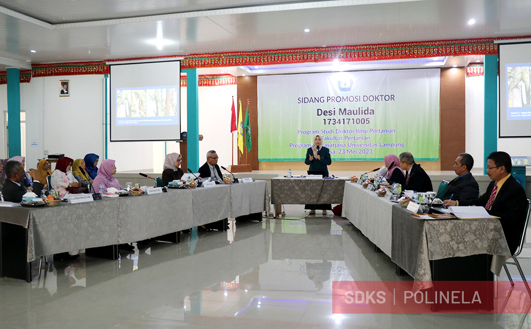 Sidang Promosi Doktor Ilmu Pertanian tersebut diketuai oleh Rektor Universitas Lampung Prof. Dr. Ir. Lusmeilia Afriani, D.E.A., I.P.M beserta Dekan Fakultas Pertanian Universitas Lampung Prof. Dr. Ir. Irwan Sukri Banuwa, M.Si. Dalam Sidang Promosi Doktor tersebut Penguji Internal, Dr. Ir. Agus Karyanto, M.Sc. dan Penguji Eksternal, dari Institut Pertanian Bogor Prof. Dr. Dewi Sukma, S.P., M.Si.