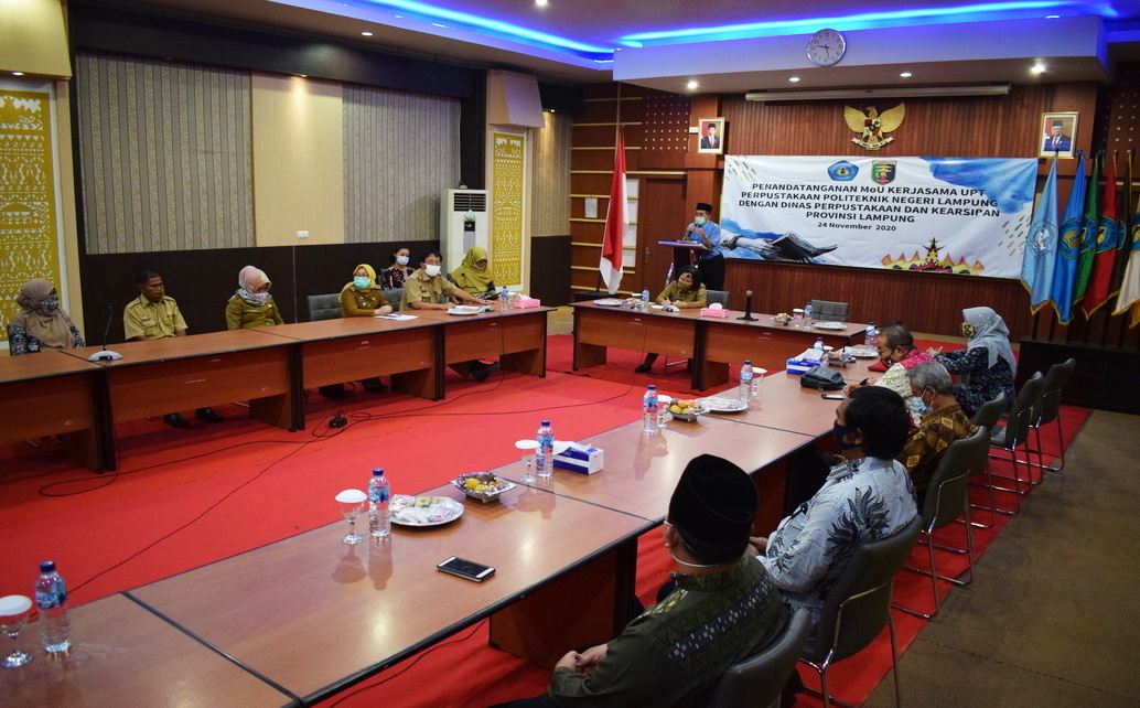 Polinela, Rabu (25/11/2020). Dinas Perpustakaan dan Kearsipan Provinsi Lampung (Disperpusarsip) melakukan penandatangan Memorandum of Understanding (MoU) dengan Politeknik Negeri Lampung (Polinela) bertempat di ruang Sidang Utama Polinela. Kesepakatan kerjasama yang tertuang dalam naskah Nota Kesepahaman adalah kerjasama untuk penguatan dan dukungan Disperpusarsip Provinsi Lampung Kepada Polinela (24/11/2020).