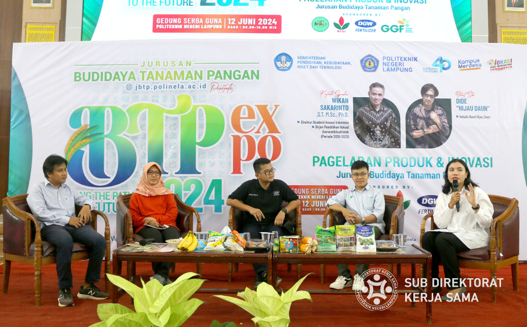 Polinela, Kamis (13/06/2024). Pada pelaksanaan BTP EXPO 2024 juga menyelenggarakan sesi talk show bersama mitra industri yang dimoderatori oleh Mustika Adzania Lestari, S.P., M.P. Sesi ini dihadiri oleh perwakilan dari berbagai perusahaan besar di bidang pertanian seperti PT. BISI Internasional, PT. Dharma Guna Wibawa, PT. Syngenta Indonesia, dan PT. Great Giant Foods.