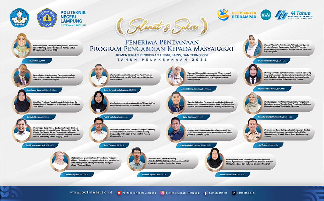 Berikut adalah daftar 17 dosen Polinela beserta judul proposal pengabdian yang lolos pendanaan nasional: