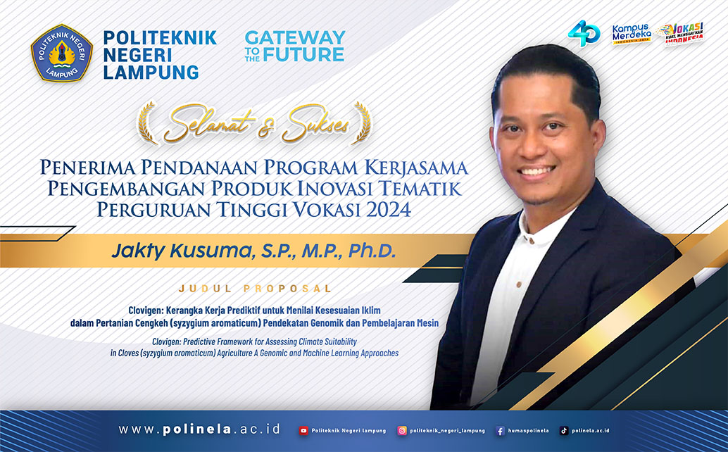 Polinela, Jum’at (05/07/2024). Dosen Politeknik Negeri Lampung (Polinela), Jakty Kusuma, S.P., M.P., Ph.D., program studi Produksi Tanaman Perkebunan jurusan Budidaya Tanaman Perkebunan, meraih bantuan pendanaan program kerjasama pengembangan produk inovasi tematik (A3 Tematik) skema penelitian kerja sama luar negeri tahun anggaran 2024. Bantuan ini diberikan oleh Direktorat Jenderal Pendidikan Vokasi, Kementerian Pendidikan, Kebudayaan, Riset, dan Teknologi.