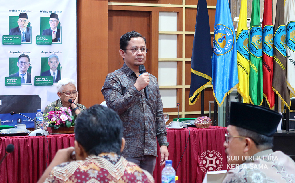 Prof. Dr. Ir. Sarono, M.Si., Direktur Polinela, Juga hadir sebagai perwakilan dari Forum Direktur Politeknik Negeri Se-Indonesia (FDPNI) dan berharap kegiatan ini menjadi ajang kolaborasi antar-politeknik dalam mendukung riset dan pengembangan industri kelapa sawit secara berkelanjutan.