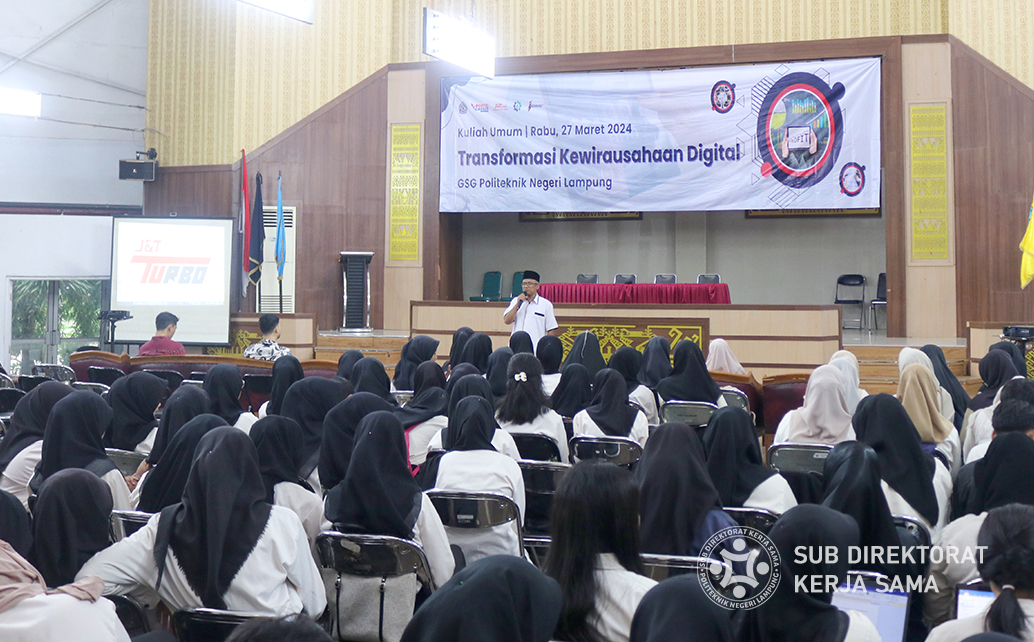 Polinela, Kamis (28/03/2024). Politeknik Negeri Lampung (Polinela) menggelar kuliah umum bertema “Transformasi Kewirausahaan Digital” yang diikuti oleh mahasiswa semester II dan IV dari Program Studi Pengelolaan Agribisnis serta Program Studi Teknologi Pangan. Kegiatan ini berlangsung di Gedung Serba Guna Polinela.