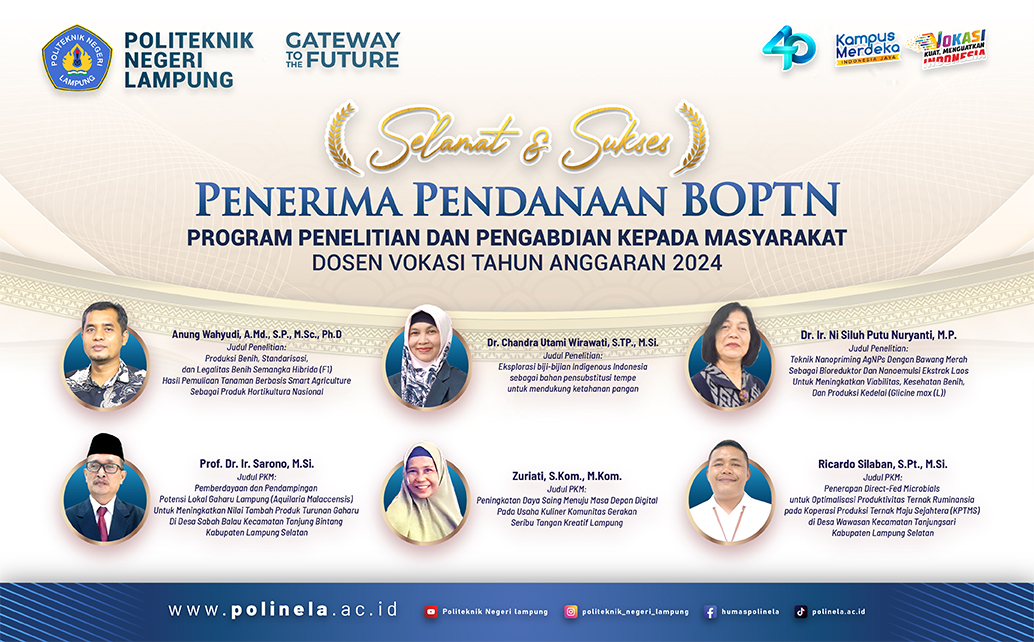 Polinela, Senin (18/03/2024). Politeknik Negeri Lampung (Polinela) kembali menorehkan prestasi, enam dosen berhasil meraih pendanaan program penelitian dan pengabdian masyarakat (PPM) melalui Bantuan Operasional Perguruan Tinggi Negeri (BOPTN) tahun 2024.Tahapan seleksi peserta, registrasi dan seleksi proposal penelitian dan pengabdian masyarakat (PKM) yang sangat ketat, dari Direktorat Akademik Pendidikan Tinggi Vokasi (DAPTV) membuat seleksi pendanaan BOPTN tahun ini menjadi lebih seru. Berikut adalah daftar nama dosen beserta judul proposal penelitian dan pengabdian masing dosen: