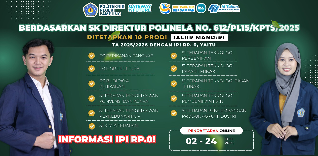 “Kami ingin memberikan peluang sebesar-besarnya bagi putra-putri terbaik bangsa, khususnya dari Lampung dan sekitarnya, untuk bisa melanjutkan pendidikan tinggi vokasi yang aplikatif dan berorientasi pada dunia kerja. Kebijakan IPI Rp0 ini merupakan bagian dari upaya Polinela dalam mendukung pemerataan pendidikan dan mengurangi hambatan ekonomi bagi calon mahasiswa,” ujar Prof. Sarono.