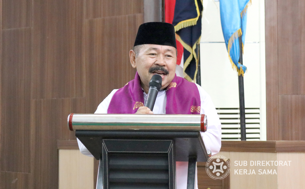 Direktur Polinela, Prof. Dr. Ir. Sarono, M.Si. Dalam sambutannya, Prof. Sarono menyampaikan kegembiraannya karena pagi itu diawali dengan mendengar tausiyah yang mampu membangkitkan semangat taqwa.