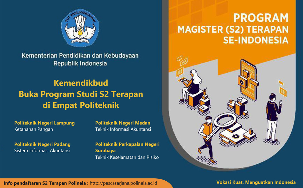 Polinela, Sabtu (30/05/2020). Kementerian Pendidikan dan Kebudayaan (Kemendikbud) membuka program Pascasarjana (S-2) Terapan di empat Politeknik Negeri untuk menjawab tantangan zaman. Program Studi Magister Terapan ini diterapkan dengan menggunakan model yang berbasis pada Rekayasa Teknologi Berbasis Penyelesaian Permasalahan atau Engineered Technology Based Problem Solving.