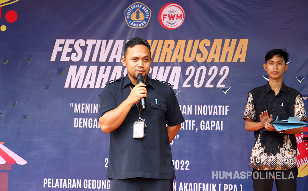 Direktur Polinela Dr. Ir, Sarono, M.Si hadir pada hari penutupan kegiatan Festival Wirausaha Mahasiswa 2022. Dalam penutupannya beliau memberikan apresiasi setinggi-tingginya kepada panita penyelenggara, Jurusan, serta Program Studi yang telah berkolaborasi dalam mensukseskan acara Festival Wirausaha Mahasiswa 2022. Dan berharap kegiatan yang bersifat kolaboratif antar Jurusan dan Program Studi khususnya dalam hal wirausaha seperti Festival Wirausaha Mahasiswa 2022 dapat secara rutin diadakan sehingga dapat menumbuhkan jiwa wirausaha di kalangan mahasiswa Polinela.