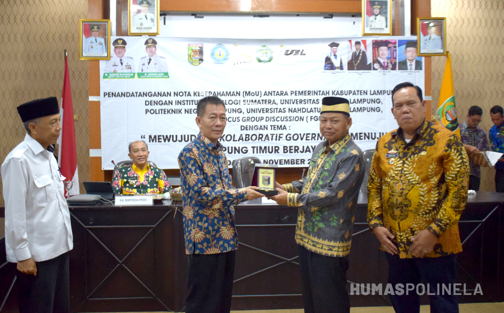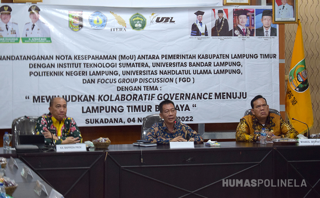POLINELA, Senin (07/11/2022). Pembantu Direktur II Politeknik Negeri Lampung, Dr. Ir. Beni Hidayat, M.Si. menghadiri penandatangan MoU dan menjadi narasumber FGD (Focus Group Discussion) dengan Pemerintah Kabupaten Lampung Timur, Pada Jum’at 4 November 2022 bertempat di Ruang Aula Utama Kantor Bupati Lampung Timur. Penandatangan ini sebagai langkah awal kolaborasi Pemerintahan dengan akademisi sekaligus mendukung sinergitas pembangunan Kabupaten Lampung Timur.