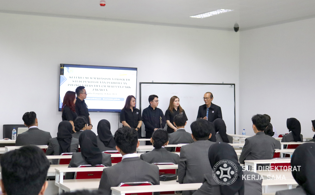 Polinela, Selasa (11/06/2024). Program Studi Pengelolaan Perhotelan Politeknik Negeri Lampung (Polinela) melaksanakan kuliah industri yang menghadirkan seorang praktisi perhotelan, Adolf Gustaf, General Manager Merlynn Park Hotel Jakarta. Kegiatan ini diikuti oleh mahasiswa program studi Pengelolaan Perhotelan semester 2 angkatan 2023, dan bertujuan untuk memberikan wawasan praktis serta inspirasi dari dunia industri perhotelan.