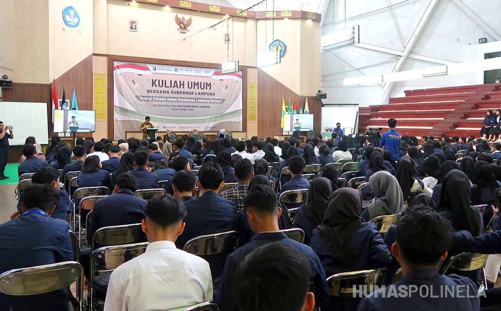 Polinela, Selasa (07/03/2023). Politeknik Negeri Lampung (Polinela) melaksanakan Kuliah umum bertema “Sinergi Polinela Dalam Mendukung Lampung Berjaya” oleh Gubernur Lampung, disampaikan oleh Kepala Badan Penelitian dan Pengembangan Daerah (Balitbangda) Lampung Ir Hamartoni Ahadis, M.Si. Kuliah umum di Gedung Serba Guna Polinela, di hadiri oleh mahasiswa dari berbagai Program Studi di Polinela pada Senin, 6 Maret 2023.