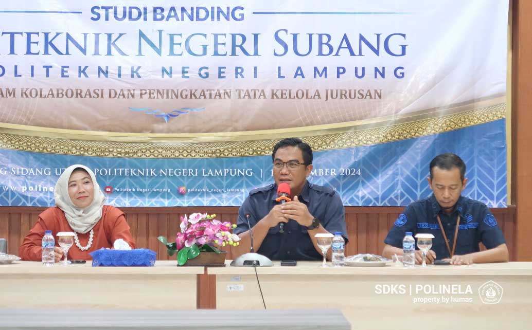 Polinela, Jum’at (20/12/2024). Politeknik Negeri Lampung (Polinela) menyambut kunjungan studi banding dari Politeknik Negeri Subang (Polsub). Rombongan Polsub, yang dipimpin oleh Wakil Direktur Bidang Akademik dan Kemahasiswaan, Wiwik Endah Rahayu, S.TP., M.Si., hadir bersama beberapa dosen dan staf pendukung.