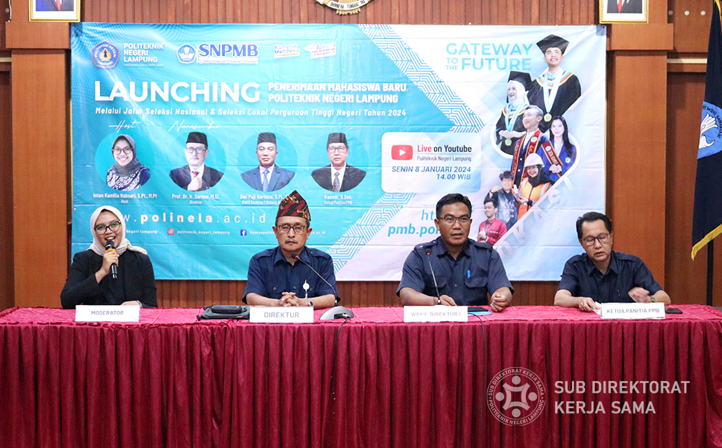 Polinela, Selasa (09/01/2023). Politeknik Negeri Lampung (Polinela) meluncurkan Penerimaan Mahasiswa Baru (PMB) Tahun 2024 di Ruang Sidang Utama Polinela, turut disiarkan secara live streaming melalui kanal YouTube resmi Polinela.