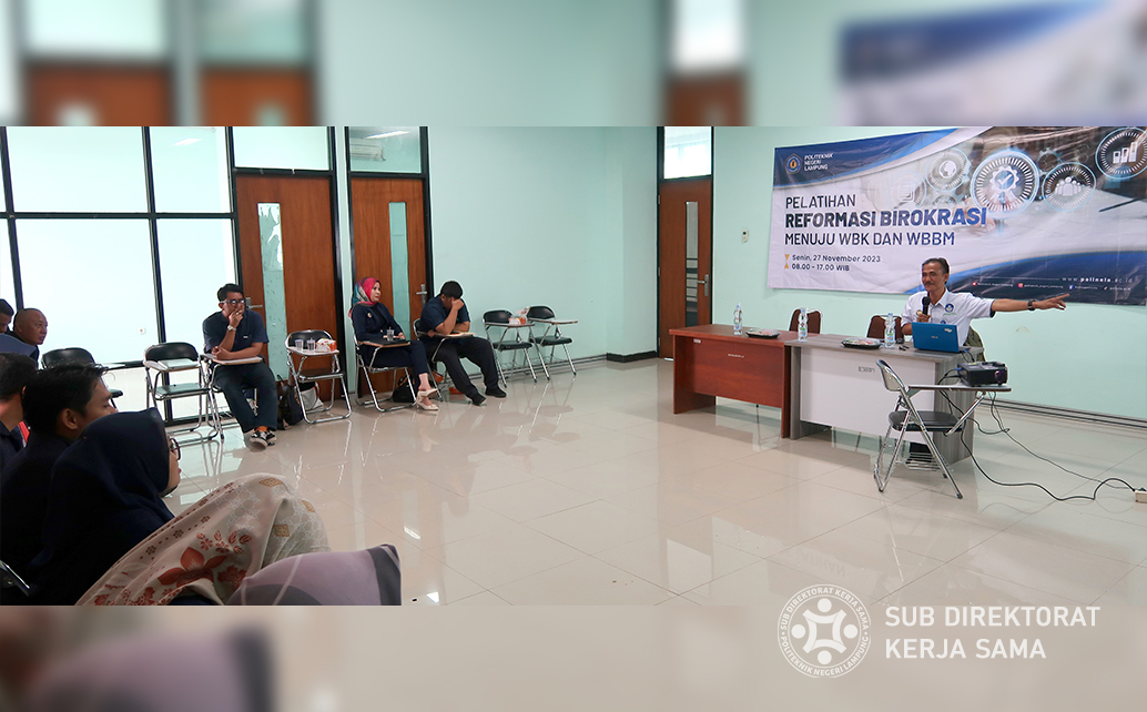 Polinela, Rabu (29/11/2023). Politeknik Negeri Lampung (Polinela) mengukuhkan komitmennya dalam mewujudkan birokrasi yang transparan, efisien, dan bersih dari korupsi melalui pelaksanaan Pelatihan Reformasi Birokrasi Menuju Wilayah Bebas dari Korupsi (WBK) dan Wilayah Birokrasi Bersih Melayani (WBBM). Kegiatan diselenggarakan oleh Tim Birokrasi Reformasi Polinela dengan menghadirkan pemateri Bambang Irawan, M.Pd., dari Balai Penjaminan Mutu Pendidikan (BPMP) Provinsi Lampung.