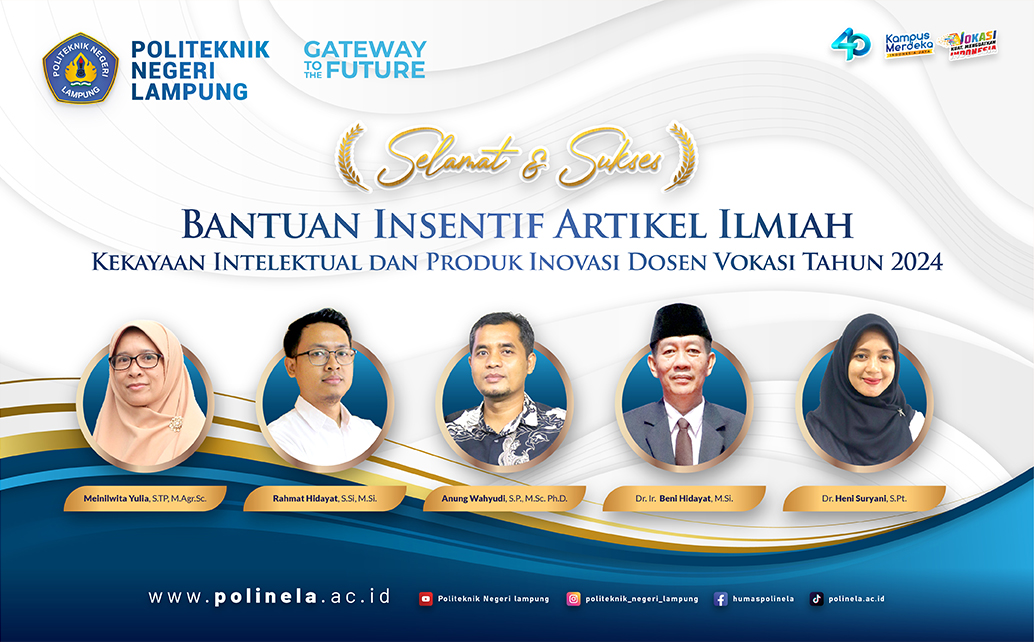 Polinela, Senin (09/09/2024). Politeknik Negeri Lampung (Polinela) kembali menunjukkan kiprahnya dalam dunia akademik dengan Sebanyak lima dosen Polinela berhasil meraih bantuan insentif dalam kategori Artikel Ilmiah, Kekayaan Intelektual, dan Produk Inovasi Dosen Vokasi Tahun 2024 dari Kementerian Pendidikan, Kebudayaan, Riset, dan Teknologi (Kemendikbudristek) melalui Direktorat Jenderal Pendidikan Vokasi.
