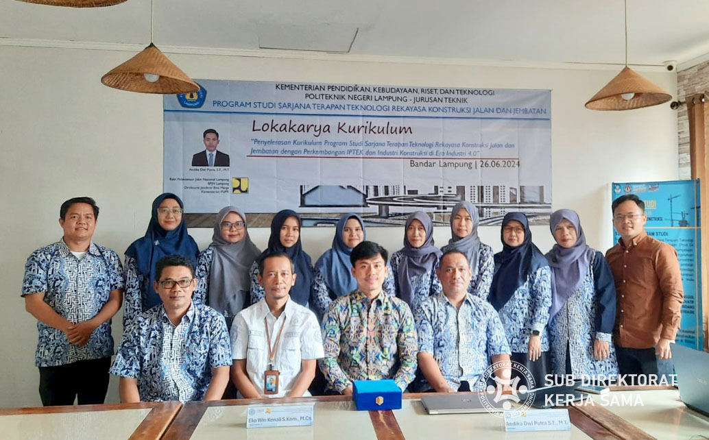 Polinela, Kamis (27/06/2024). Program Studi Teknologi Rekayasa Konstruksi Jalan dan Jembatan (TRKJJ) Jurusan Teknik Politeknik Negeri Lampung (Polinela) gelar lokakarya penyelarasan kurikulum yang bertujuan memperbaiki dan mengembangkan kurikulum yang sudah ada. Kegiatan ini dilatarbelakangi oleh analisa hasil perjalanan implementasi kurikulum sebelumnya serta lulusan yang dihasilkan, dengan fokus utama untuk menyesuaikan kurikulum dengan kebutuhan Dunia Usaha dan Dunia Industri (DuDi), perkembangan zaman dan teknologi, serta perubahan kebijakan pemerintah dari Kementerian Pendidikan, Kebudayaan, Riset, dan Teknologi (Kemendikbudristek).