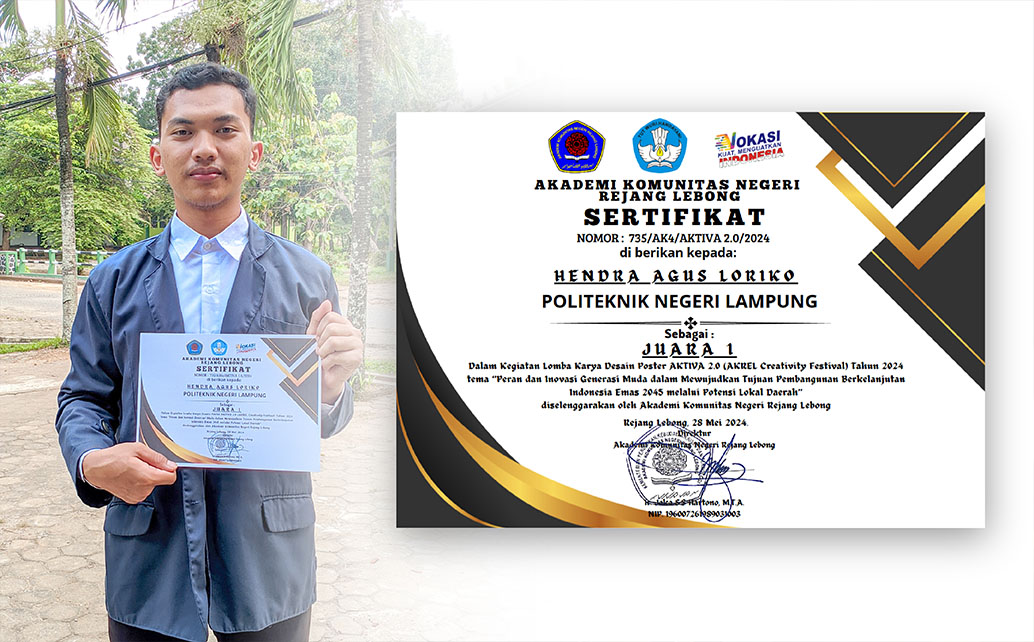 Polinela, Selasa (25/06/2024). Mahasiswa Politeknik Negeri Lampung (Polinela) Jurusan Teknologi Informasi Program Studi Manajemen Informatika, Hendra Agus Loriko meraih Juara 1 pada kegiatan Lomba Karya Desain Poster AKTIVA 2.0 (AKREL Creativity Festival) 2024. Kegiatan bertema “Peran Dan Inovasi Generasi Muda Dalam Mewujudkan Tujuan Pembangunan Berkelanjutan Indonesia Emas 2045 Melalui Potensi Lokal Daerah”. Diselenggarakan oleh Akademi Komunitas Negeri Rejang Lebong (AKREL).