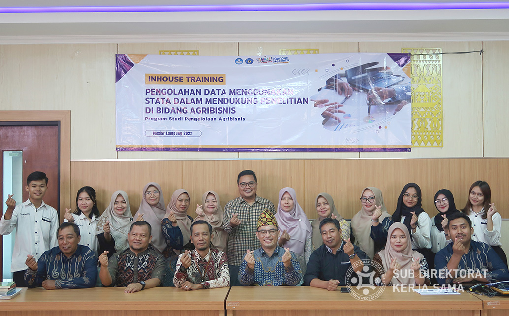 Polinela, Senin (30/10/2023). Politeknik Negeri Lampung (Polinela) menggelar “In House Training Pengolahan Data Menggunakan STATA Dalam Mendukung Penelitian di Bidang Agribisnis” pada Sabtu, 28 Oktober 2023, di Ruang Sidang A Polinela. Kegiatan diselenggarakan oleh program studi Pengelolaan Agribisnis sebagai bagian dari upaya untuk meningkatkan kapasitas dosen, plp dan mahasiswa di bidang agribisnis. Acara ini merupakan kesempatan yang sangat berharga untuk memperluas pengetahuan dan keterampilan dalam pengelolaan data penelitian, dengan fokus pada aplikasi STATA.