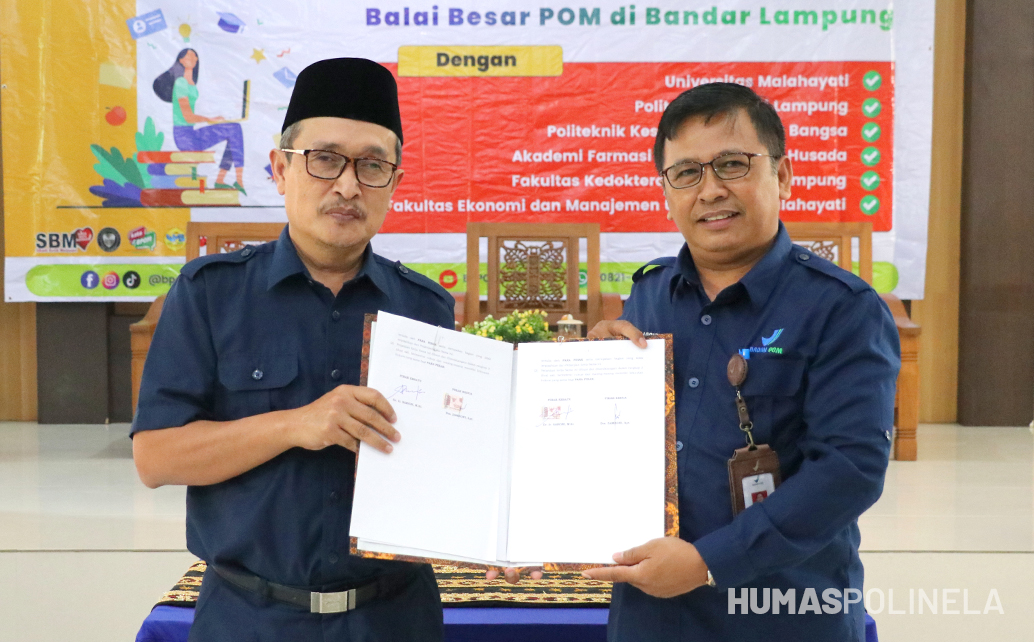 Penandatanganan dilakukan langsung oleh Direktur Polinela Dr. Ir Sarono, M.Si dan Ketua Balai Besar Pengawas Obat dan Makanan Lampung Drs. Zamroni, Apt.