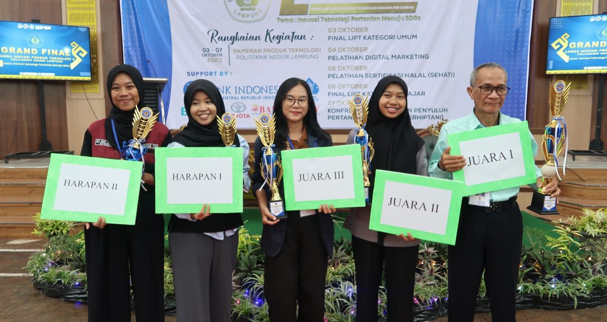 Polinela, Kamis (05/10/2023). Pengumuman pemenang Lomba Inovasi Produk Teknologi III Kategori Umum yang dilaksanakan pada Selasa, 3 Oktober lalu yang dilaksanakan di gedung serba guna Polinela. Peserta merupakan unsur UMKM, Petani, dan Mahasiswa. Dengan dewan juri yaitu: