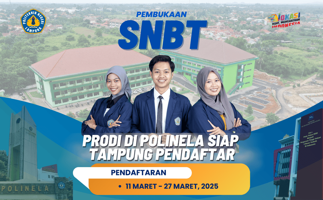 Polinela, Selasa (11/03/2025). Politeknik Negeri Lampung (Polinela) siap menyambut calon mahasiswa baru (Camaba) yang akan mendaftar melalui jalur Seleksi Nasional Berbasis Tes (SNBT) 2025. Pendaftaran SNBT telah resmi dibuka pada 11 Maret dan akan berlangsung hingga 27 Maret 2025. Sebagai perguruan tinggi vokasi terkemuka, Polinela menawarkan berbagai program studi yang siap menampung mahasiswa baru dengan daya saing tinggi.