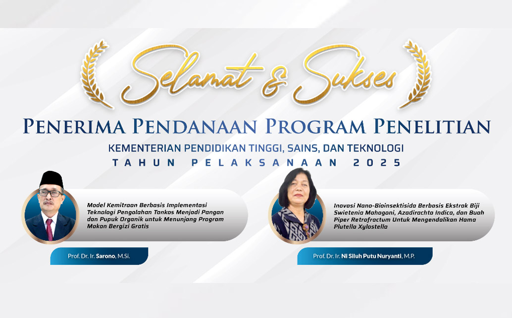 1. Prof. Dr. Ir. Ni Siluh Putu Nuryanti, M.P., sebagai Ketua Pengusul dengan judul proposal “Inovasi Nano-Bioinsektisida Berbasis Ekstrak Biji Swietenia Mahagoni, Azadirachta Indica, dan Buah Piper Retrofractum untuk Mengendalikan Hama Plutella Xylostella”. Penelitian ini mengusung pendekatan bioteknologi berkelanjutan guna mengurangi ketergantungan terhadap insektisida kimia sintetis dan mendukung pertanian ramah lingkungan.