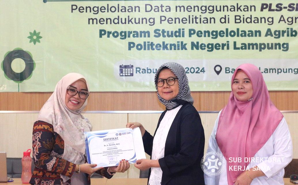 Polinela, Kamis (15/08/2024). Program Studi Agribisnis Politeknik Negeri Lampung (Polinela) menyelenggarakan kegiatan Inhouse Training Pengolahan Data Menggunakan SEM-PLS untuk mendukung penelitian di bidang agribisnis. Kegiatan berlangsung pada Rabu, 14 Agustus. Dihadiri dan dibuka secara resmi oleh Sekretaris Jurusan Ekonomi Bisnis, Marlinda Apriyani, S.P., M.P.