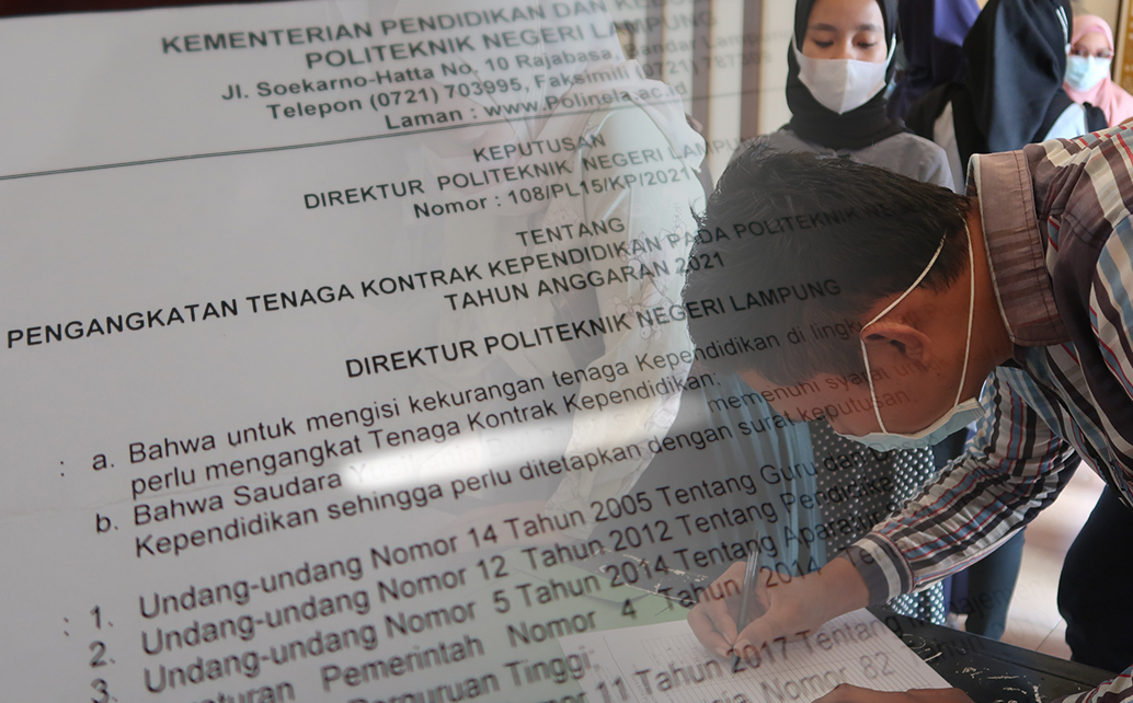 Polinela, Selasa (26/01/2021). Bagian Administrasi Umum dan Kepegawaian melaksanakan penyerahan SK Tenaga Kependidikan Kontrak di Politeknik Negeri Lampung (Polinela) bertempat di GSG Polinela dengan tetap menerapkan protokol kesehatan dan dihadiri oleh 50 orang Tenaga Kependidikan Kontrak Polinela. Acara ini dihadiri langsung oleh Koordinator Administrasi Umum dan Kepegawaian Zahermanto, S.P., M.H. mewakili Pembantu Direktur II.