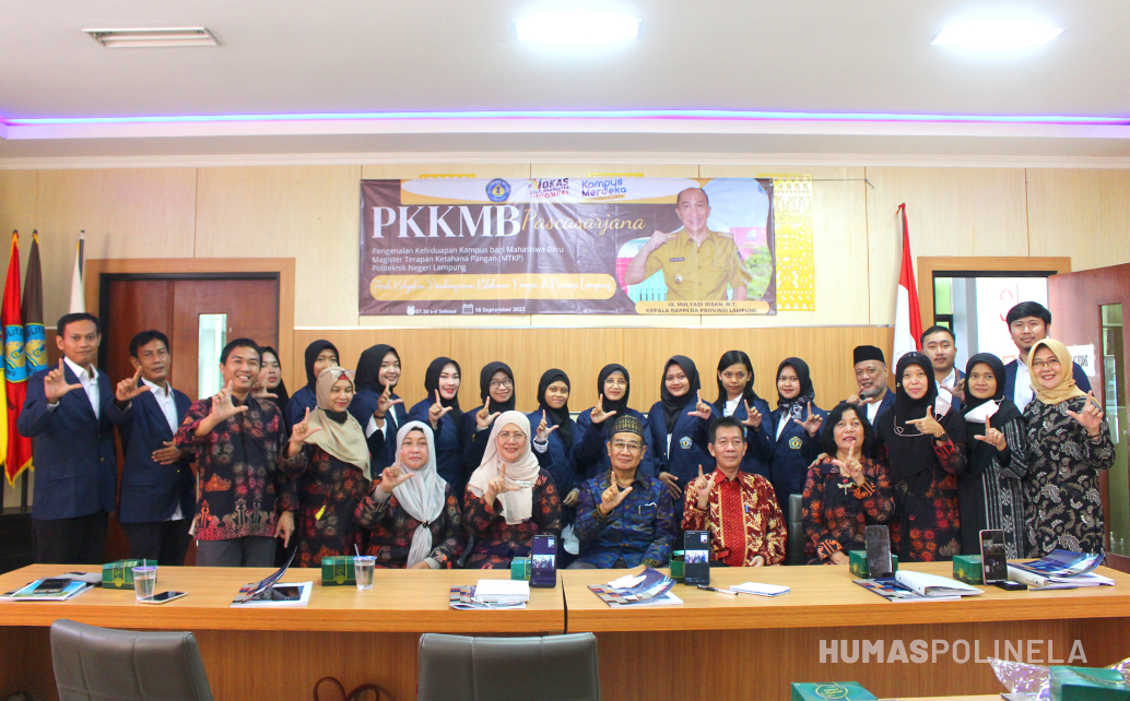 Polinela, Selasa (13/09/2022). Direktur Politeknik Negeri Lampung (Polinela) Dr. Ir. Sarono, M.Si. pada hari Sabtu tanggal 10 September 2022 mengukuhkan 16 mahasiswa baru Program Pascasarjana Magister (S2) Terapan Pertanian Program Studi Ketahanan Pangan (MTKP) dalam acara Pengenalan Kehidupan Kampus Mahasiswa Baru (PKKMB) Tahun Akademik 2022/2023 bertempat di ruang sidang A Polinela. Hadir dalam acara tersebut Kepala Bappeda Provinsi Lampung Ir. Mulyadi Irsan, M.T., Direktur Polinela, Pembantu Direktur I, Pembantu Direktur II, Pembantu Direktur III, dan Ketua Pengelola Pascarajana MTKP Dr. Irmayani Noer, S.P., M.Si.
