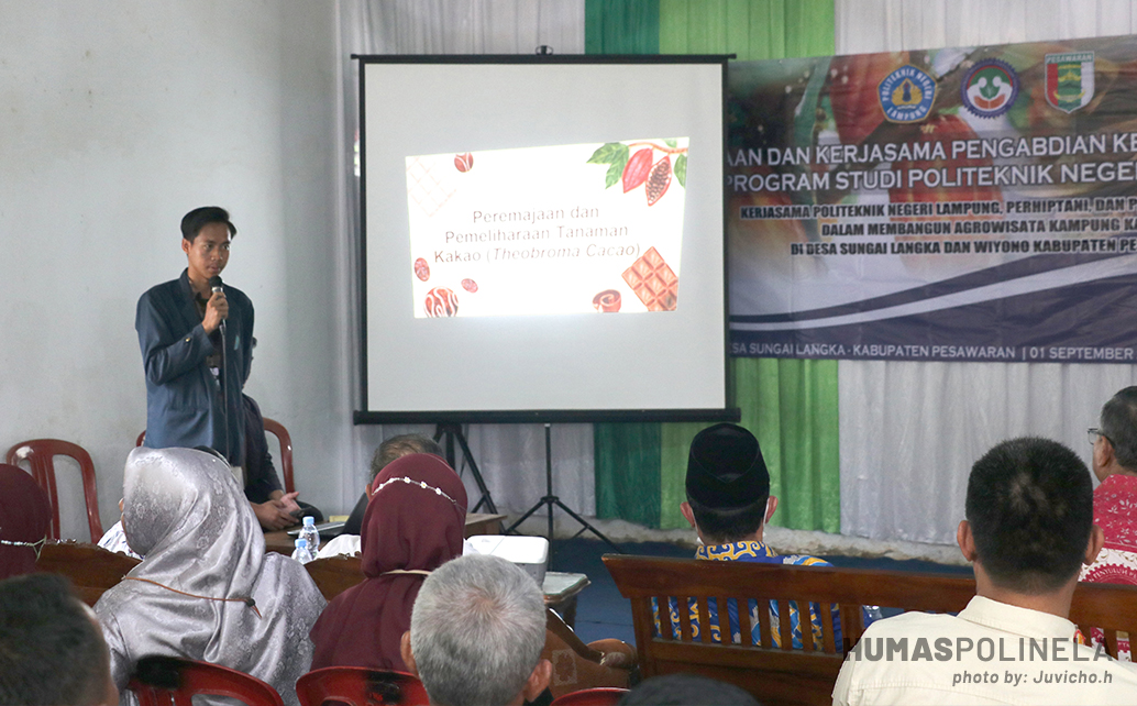 Kegiatan diawali dengan Sambutan oleh Penanggung Jawab Kegiatan Ir. Zainal Mutaqin, M.Si, beliau menyampaikan “kegiatan ini merupakan tindak lanjut dari kerjasama Polinela, Perhiptani dan Pemda Pesawaran dalam membina Desa Sungai Langka dan Desa Wiyono sebagai desa binaan kakao”. Dilanjutkan dengan sambutan dari Kepala Dinas Perkebunan Pesawaran, Fisky Firdaus, S.Hut., beliau menyampaikan “Pemda Pesawaran dengan serius akan mensupport semua upaya pembinaan, terutama SDM Polinela dalam sektor pertanian khususnya perkebunan kakao di Desa Sungai Langka dan Desa Wiyono.