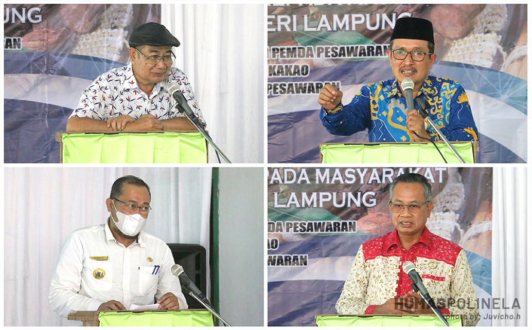 Selanjutnya sambutan oleh Ketua Dewan Pimpinan Wilayah Perhiptani Provinsi Lampung Ir. Sutono, M.Si dalam sambutanya beliau menyampaikan “Kami akan membantu untuk semua tim penyuluh, baik dalam pengembangan sdm menuju terwujudnya kampung kakao dan kerajinan tangan masyarakat setempat. Sambutan terahir disampaikan oleh direktur Polinela Dr Ir Sarono,M.Si. beliau menyampaikan”saya sangat mengapresiasi kinerja tim antara Polinela, Perhiptani dan Pemda Pesawaran sehingga terselenggaranya kegiatan seremonial ini, Kegiatan ini selain tindak lanjut kerjasama antara Polinela, Perhiptani dan Pemda Pesawaran, juga dilangsungkan kegiatan PKN ekspo oleh mahasiswa Polinela yg berada sekitar Kecamatan Gedong Tataan”.