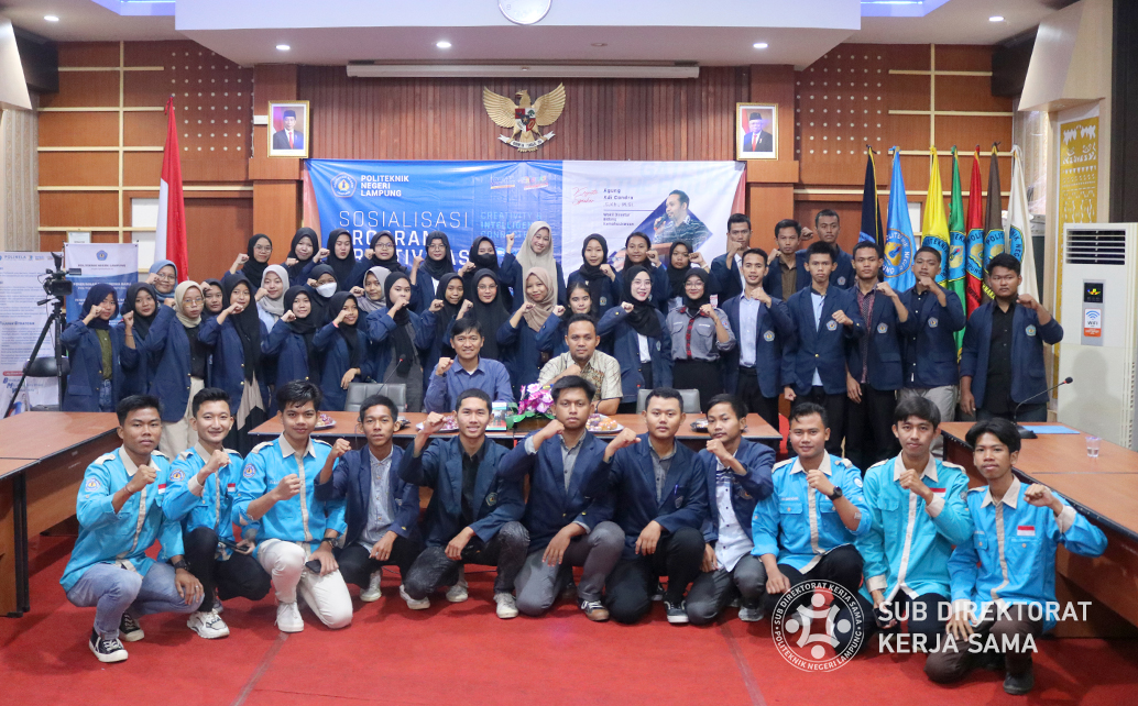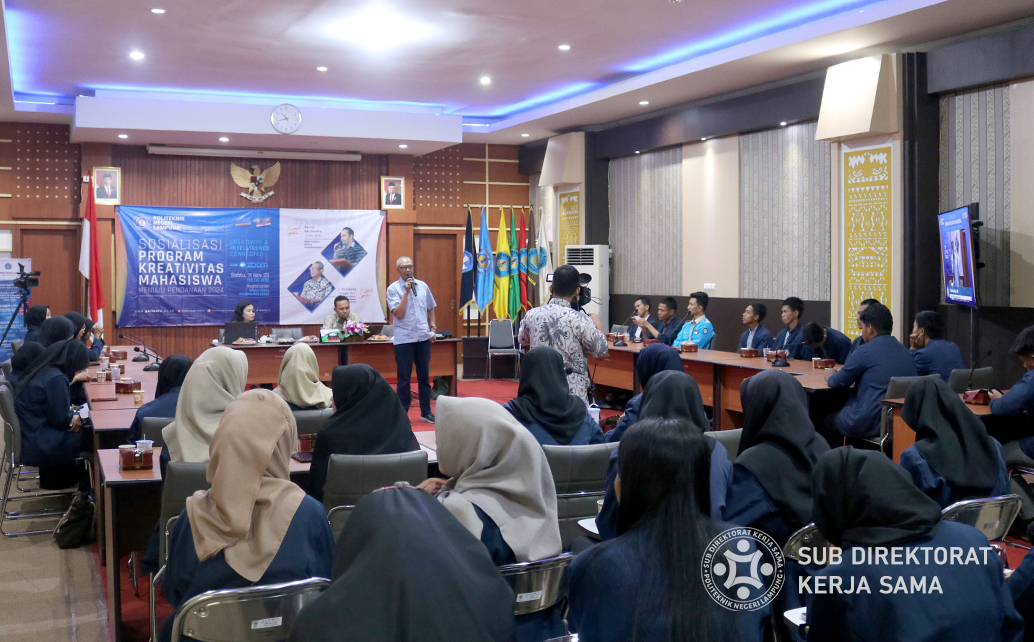 Polinela, Sabtu (11/11/2023). Politeknik Negeri Lampung (Polinela) menggelar Sosialisasi Program Kreativitas Mahasiswa Menuju Pendanaan 2024. Kegiatan ini bertujuan memberikan panduan dan motivasi kepada mahasiswa dalam mengembangkan kreativitas melalui Program Kreativitas Mahasiswa (PKM) dengan menghadirkan dua keynote speaker, yaitu Agung Adi Candra S.Kh., M.SI., Wakil Direktur Bidang Kemahasiswaan, dan Ir. Bambang Utoyo, M.P., Reviewer PKM Nasional.