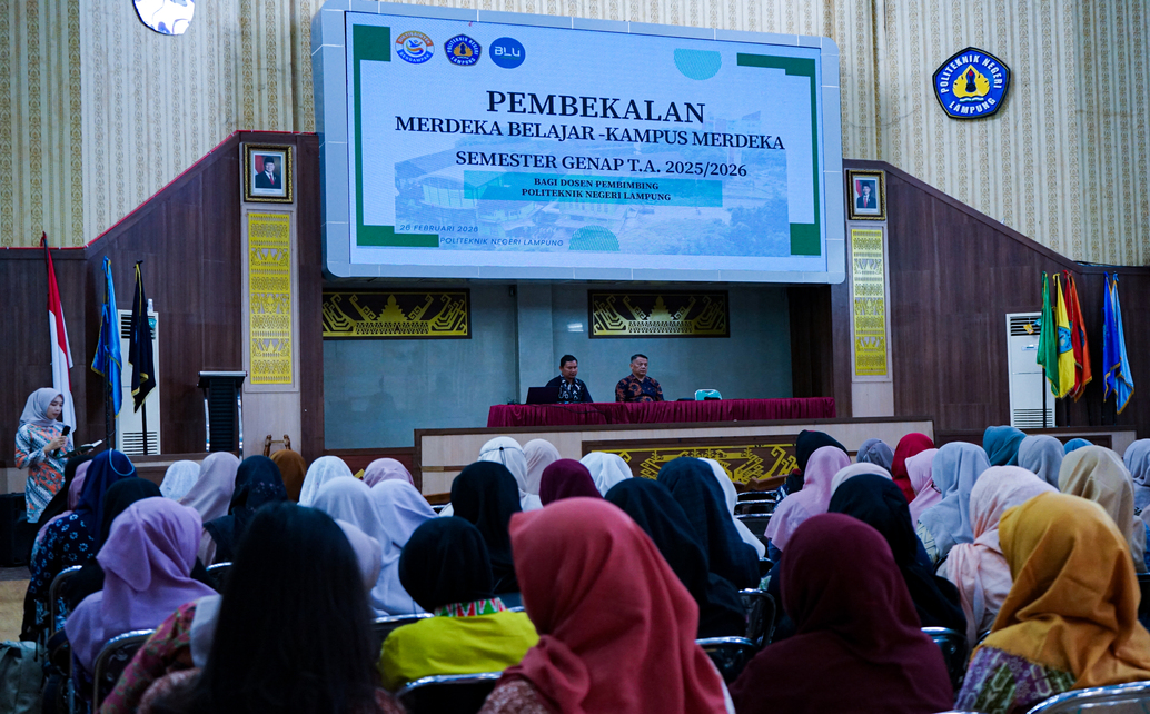 Polinela, Kamis (26/02/2026). Politeknik Negeri Lampung (Polinela) menggelar Pembekalan Dosen Pembimbing Merdeka Belajar–Kampus Merdeka (MBKM) Semester Genap Tahun Akademik 2025/2026 bertempat di GSG Polinela. Kegiatan ini difokuskan pada penguatan pembimbingan Magang Industri skema MBKM guna memastikan implementasi berjalan terstruktur, terukur, dan selaras dengan standar akademik institusi.