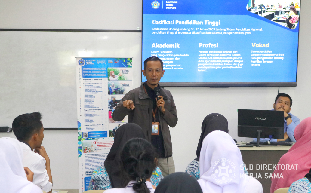 Polinela, Selasa (05/11/2023). Politeknik Negeri Lampung (Polinela) menerima kunjungan dari SMA Negeri 1 Candipuro dalam upaya untuk memberikan wawasan kepada siswa-siswi kelas 12 tentang dunia perkuliahan dan menumbuhkan minat mereka untuk melanjutkan ke perguruan tinggi.