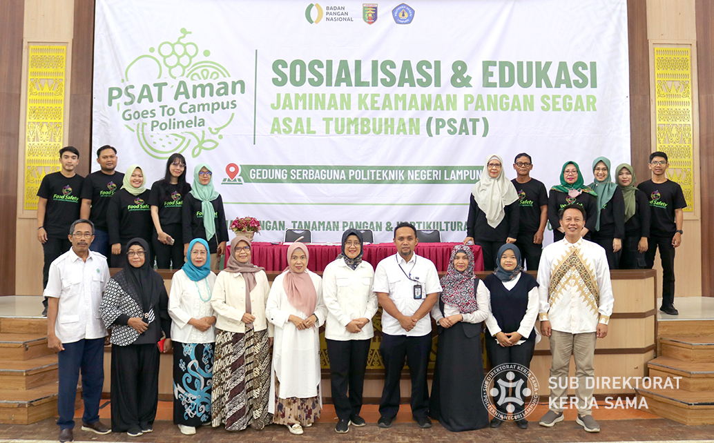 Polinela, Jum’at (22/03/2024). Politeknik Negeri Lampung (Polinela) menggelar sosialisasi dan edukasi mengenai jaminan keamanan pangan segar asal tumbuhan (PSAT) bagi mahasiswa semester II dan IV program studi Teknologi Pangan yang bertujuan untuk meningkatkan kesadaran akan jaminan keamanan pangan segar asal tumbuhan (PSAT) di kalangan mahasiswa. Kegiatan ini diselenggarakan atas kerjasama dengan Dinas Ketahanan Pangan, Tanaman Pangan Dan Hortikultura Provinsi Lampung, Unit Pelaksana Teknis Dinas (UPTD) Balai Pengawasan Mutu dan Keamanan Pangan (BPMKP). Kegiatan berlangsung di Gedung Serba Guna (GSG) pada Rabu, 20 Maret 2024.