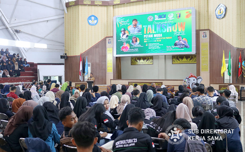 Polinela, Selasa (10/09/2024). Politeknik Negeri Lampung (Polinela) bersama Aliansi Organis Indonesia (AOI) menggelar talkshow bertema “Petani Muda sebagai Pilar Kedaulatan Pangan dan Perubahan Iklim” di Polinela. Kegiatan ini dihadiri oleh lebih dari 350 peserta, termasuk mahasiswa Polinela dari berbagai program studi, dosen, mahasiswa Universitas Lampung, petani, serta anggota AOI dan pemerintah daerah.