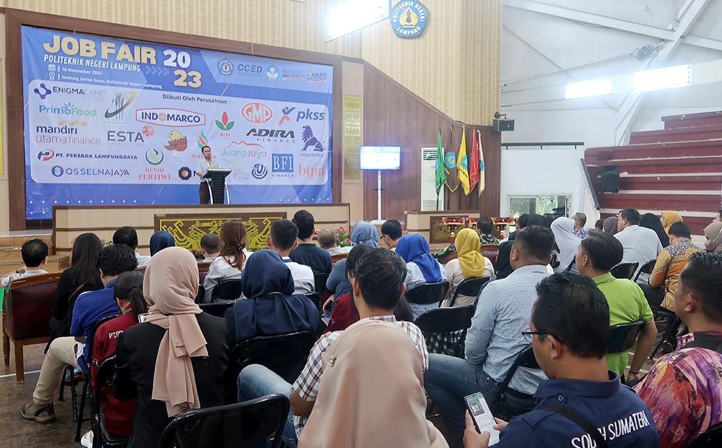 Polinela, Kamis (16/11/2023). Politeknik Negeri Lampung (Polinela) melalui Unit Penunjang Akademik (UPA) Center for Career and Entrepreneurship Development (CCED) menyelenggarakan Job Fair Polinela 2023. Kegiatan diikuti oleh 20 perusahaan ternama yang berkomitmen untuk memberikan peluang karir dan pengembangan wirausaha kepada para peserta yang hadir. Terhitung 129 lowongan tersedia pada Job Fair ini. Kegiatan di laksanakan di Gedung Serba Guna Polinela.