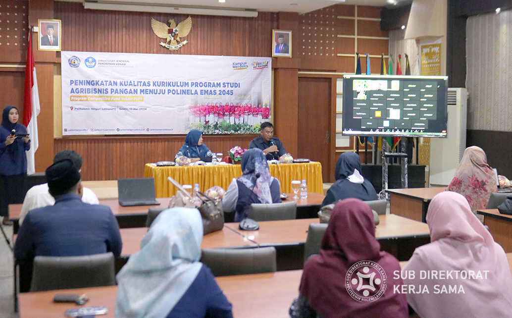 Polinela, Senin (13/05/2024). Program Studi Agribisnis Pangan Politeknik Negeri Lampung (Polinela) menggelar Lokakarya Kurikulum bertema “Peningkatan Kualitas Kurikulum Program Studi Agribisnis Pangan Menuju Polinela Emas 2045″ Dalam Program Competitive Fund Vokasi 2024”. Kegiatan ini diadakan sebagai upaya Polinela untuk meningkatkan mutu pendidikan dan daya saing lulusan dalam rangka menyongsong masa depan yang lebih gemilang.