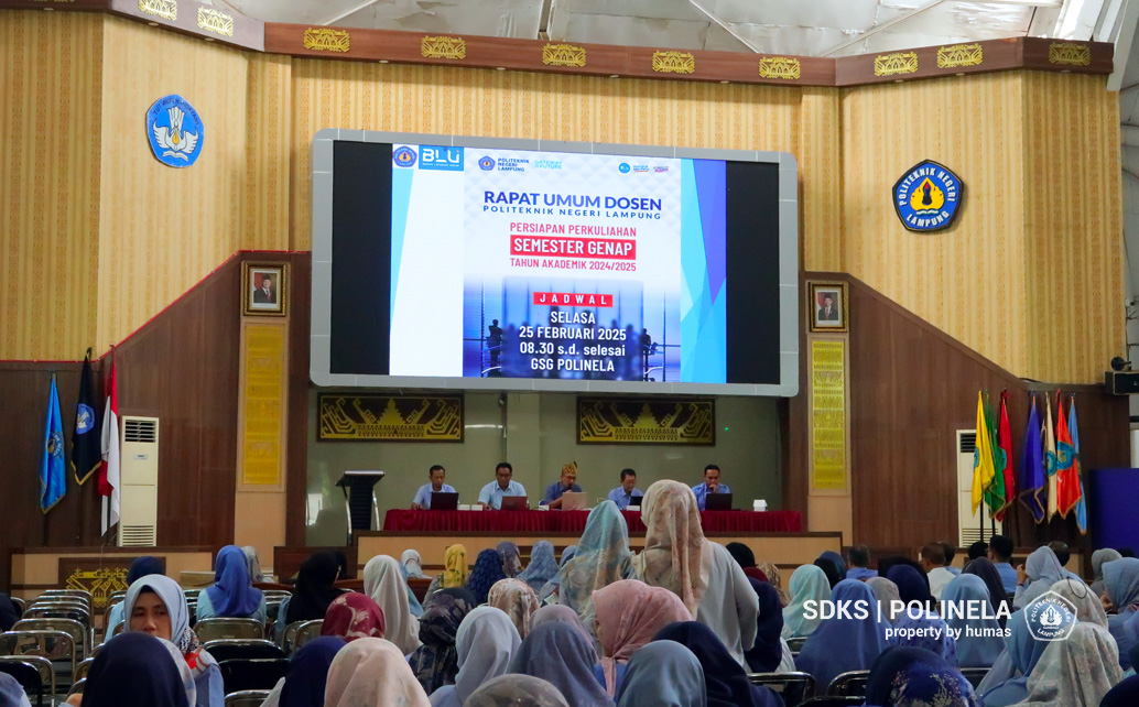 Polinela, Rabu (26/02/2025).Politeknik Negeri Lampung (Polinela) menggelar rapat umum dosen dalam rangka membahas persiapan perkuliahan semester genap Tahun Akademik 2024/2025. Kegiatan ini dilaksanakan di Gedung Serba Guna (GSG) dan diikuti oleh seluruh dosen dari delapan jurusan yang ada di lingkungan Polinela.
