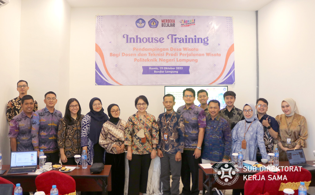 Polinela, Kamis (19/10/2023). Politeknik Negeri Lampung (Polinela), melalui program studi D3 Perjalanan Wisata menggelar Inhouse Training Pendampingan Desa Wisata bagi dosen dan teknisi Program Studi Perjalanan Wisata,dengan menghadirkan narasumber Direktur Pengembangan SDM Pariwisata Deputi Bidang Sumberdaya dan Kelembagaan Kemenparekraf Republik Indonesia, di Hotel Horison Lampung.Kegiatan ini bertujuan untuk meningkatkan kompetensi dan pemahaman para tenaga pendidik dan teknisi dalam mengembangkan potensi dan pendampingan desa wisata di Provinsi Lampung. Kegiatan IT dilaksanakan di Hotel Horison Lampung.