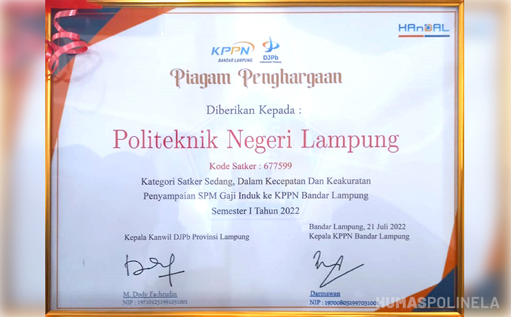 Polinela, Kamis (21/07/2022). Politeknik Negeri Lampung meraih Penghargaan dari KPPN Bandar Lampung dengan kategori Satker Sedang, Dalam Kecepatan Keakuratan Penyampaian SPM Gaji Induk ke KPPN Bandar Lampung Semester 1 Tahun 2022.