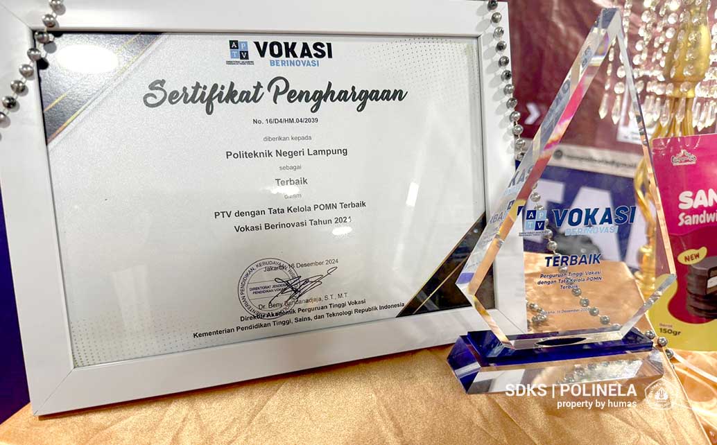 Polinela, Selasa (17/12/2024). Politeknik Negeri Lampung (Polinela) meraih penghargaan sebagai Perguruan Tinggi Vokasi (PTV) dengan Tata Kelola Program Ormawa Membangun Negeri (POMN) Terbaik dalam ajang Vokasi Berinovasi tahun 2024, dari Direktur Akademik Perguruan Tinggi Vokasi, Kementerian Pendidikan Tinggi Sains danTeknologi,Pada ajang Vokasi Berinovasi. Penghargaan ini diberikan atas keberhasilan Polinela dalam melaksanakan program POMN untuk tujuan pemberdayaan masyarakat yang inovatif dan memberikan dampak nyata.